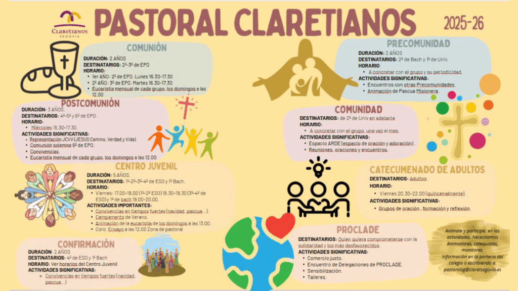 En la siguiente infografía se detallan los grupos, horarios y principales actividades pastorales que se desarrollarán a lo largo del curso.